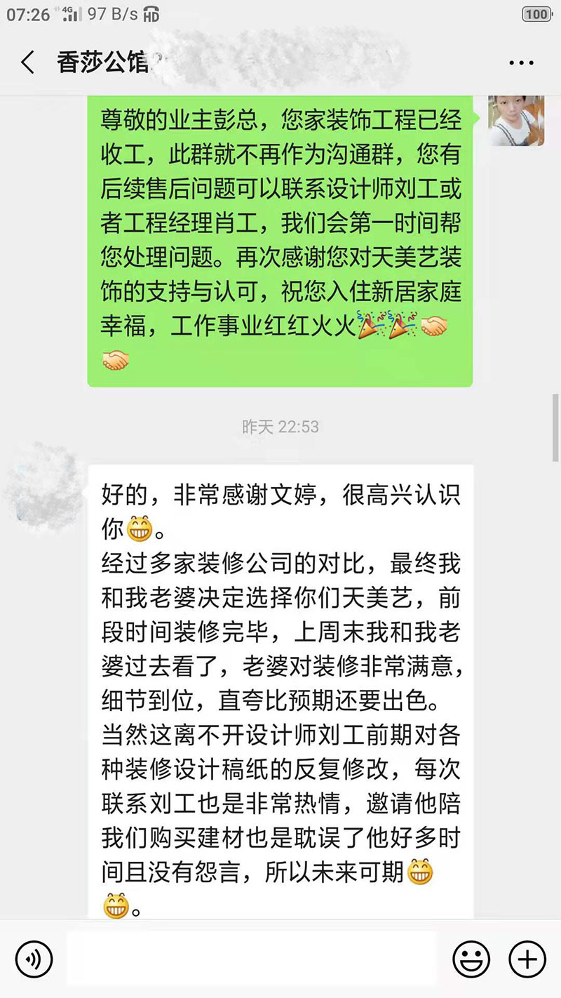 經過多家裝修公司的對比,最終我和我老婆決定選擇你們天美藝,前段時間裝修完畢,上周末我和我老婆過去看了,老婆對裝修非常滿意,細節到位,直夸比預期還要出色。當然這離不開設計師劉工前期對各種裝修設計稿紙的反復修改,每次聯系劉工也是非常熱情,邀請他陪我們購買建材也是耽誤了他好多時間且沒有怨言,所以未來可期。